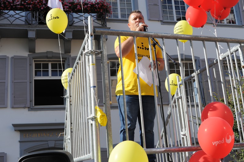 Ein weiteres Thema stand im Mittelpunkt der Rede von Regula Meschberger vom VPOD. „Wir alle wissen, dass der Kanton sich in einer finanziellen Schieflage befindet, weil er in verschiedener Hinsicht über seine Verhältnisse gelebt, zu viel Geld in riesige Strassenprojekte verlocht und mit einer ebenso teuren wie erfolglosen Wirtschaftsoffensive versucht hat, neue Firmen in den Kanton zu holen“, so die VPOD-Frau, „wir wissen aber auch, wer für diese Politik nicht verantwortlich ist und wer in diesem Kanton nicht über seine Verhältnisse lebt: Es sind alle jene, die für ihren Arbeits- oder Schulweg auf einen funktionierenden öffentlichen Verkehr angewiesen sind, es sind die Menschen mit kleinem Einkommen, die auf Prämienverbilligungen angewiesen sind und es sind vor allem auch die Mitarbeitenden dieses Kantons!“ Ihre Schlussfolgerung: Ohne gezielte, allenfalls befristete Erhöhungen für all jene, die in den letzten Jahren von Steuersenkungen profitiert hätten, sei dieses Sparpaket inakzeptabel. Und wurde dann noch deutlicher: „Ohne ein Minimum an Opfersymmetrie sehe ich den sozialen Frieden in diesem Kanton in Gefahr!“