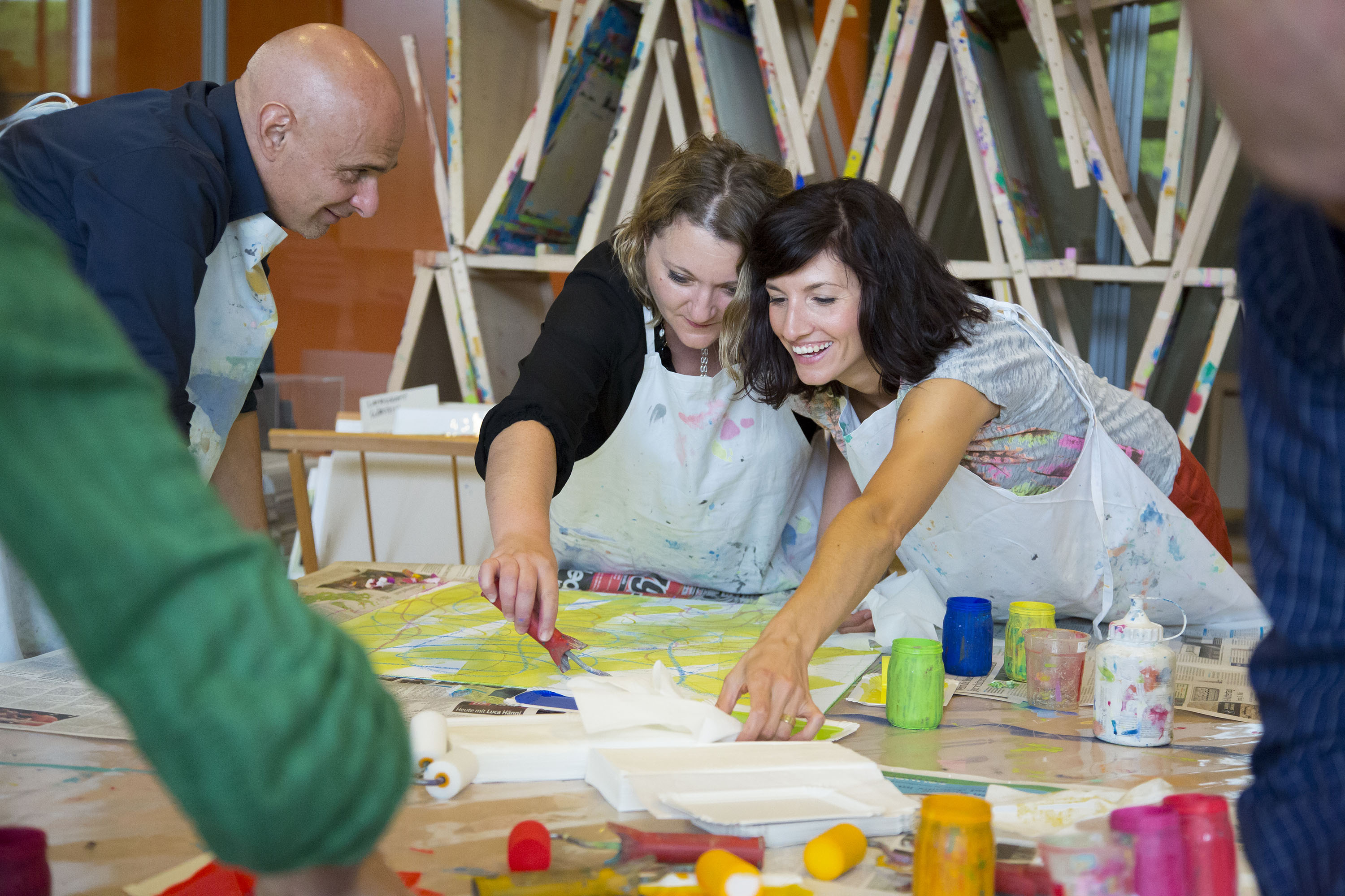Ein Kunstvermittlungsworkshop in Französisch oder Englisch als spielerische Sprachlektion? Botanisches Gestalten vor dem Hintergrund der Flora Helvetica und dem Herbar von Paul Klee? Puppenbau als Grundlage für ein Schultheaterprojekt? Das Creaviva, die Kreativwerkstatt im Zentrum Paul Klee, begleitet Sie und Ihre Klasse auch beispielsweise beim Versuch, vor dem Hintergrund von Einsteins Relativitätstheorie Zeit zu malen. Vielleicht interessieren Sie sich unter den aussergewöhnlichen Wellen von Renzo Piano eher für die Grundfragen von Architektur. Oder Sie arbeiten mit Pixeln statt Pinseln an animierten Kurzfilmen. Die Workshops im Creaviva sind ein sorgfältig auf unterschiedlichste Anliegen ausgerichteter Mix aus Kunst-, Wissens- und Kompetenzvermittlung. Erleben können Sie dies auch, wenn Sie als Team oder als Kollegium Hand in Hand an der gestalterischen Umsetzung von Themen aus Ihrem Lehrerzimmer arbeiten.